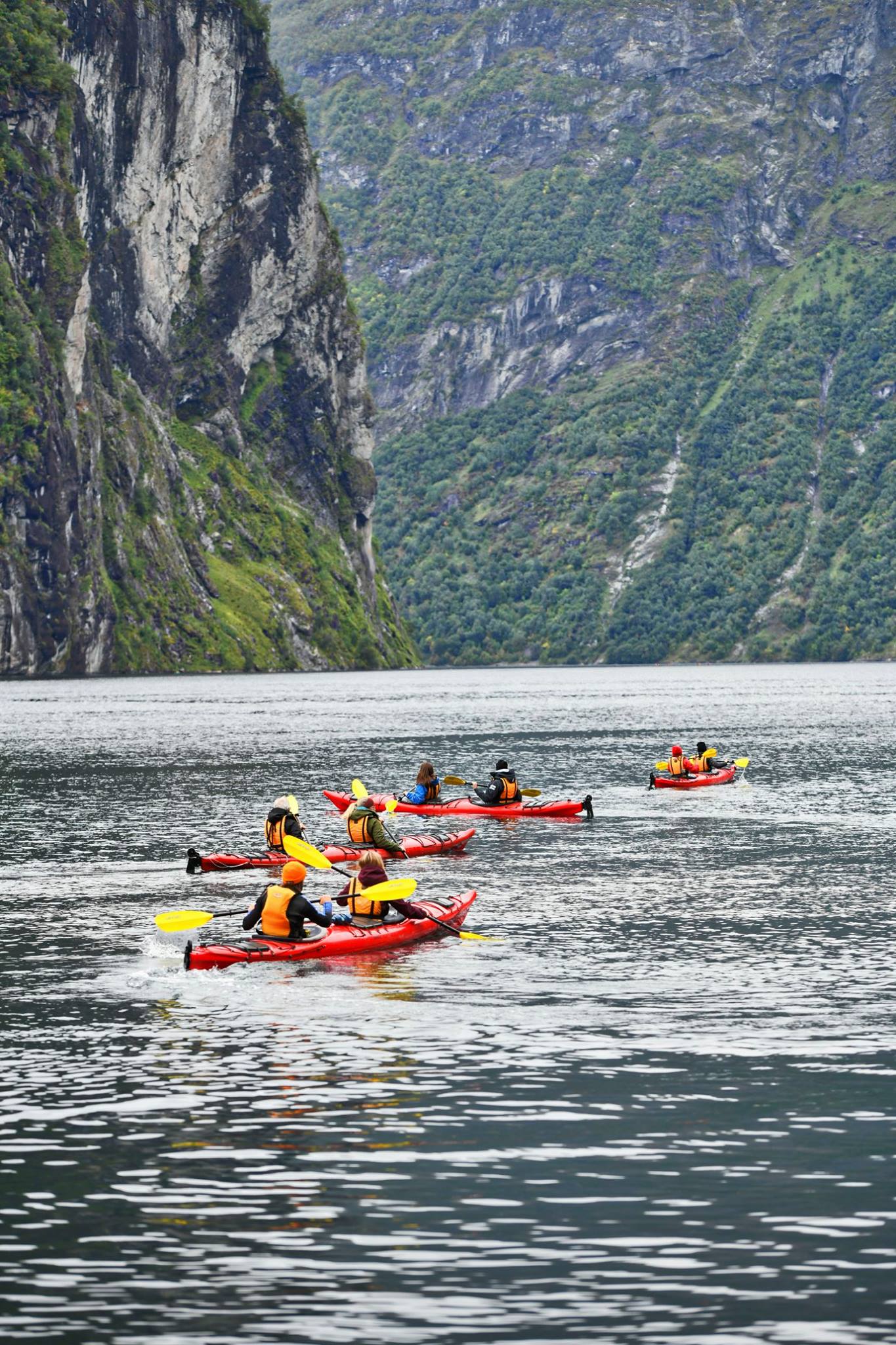 After a safety briefing, and being kitted out in life preservers, we set out on the saltwater of Geirangerfjord in kayaks, heading through the 260 metre-deep seaway surrounded by towering 1,700m cliffs that dwarf even the biggest cruise ships.