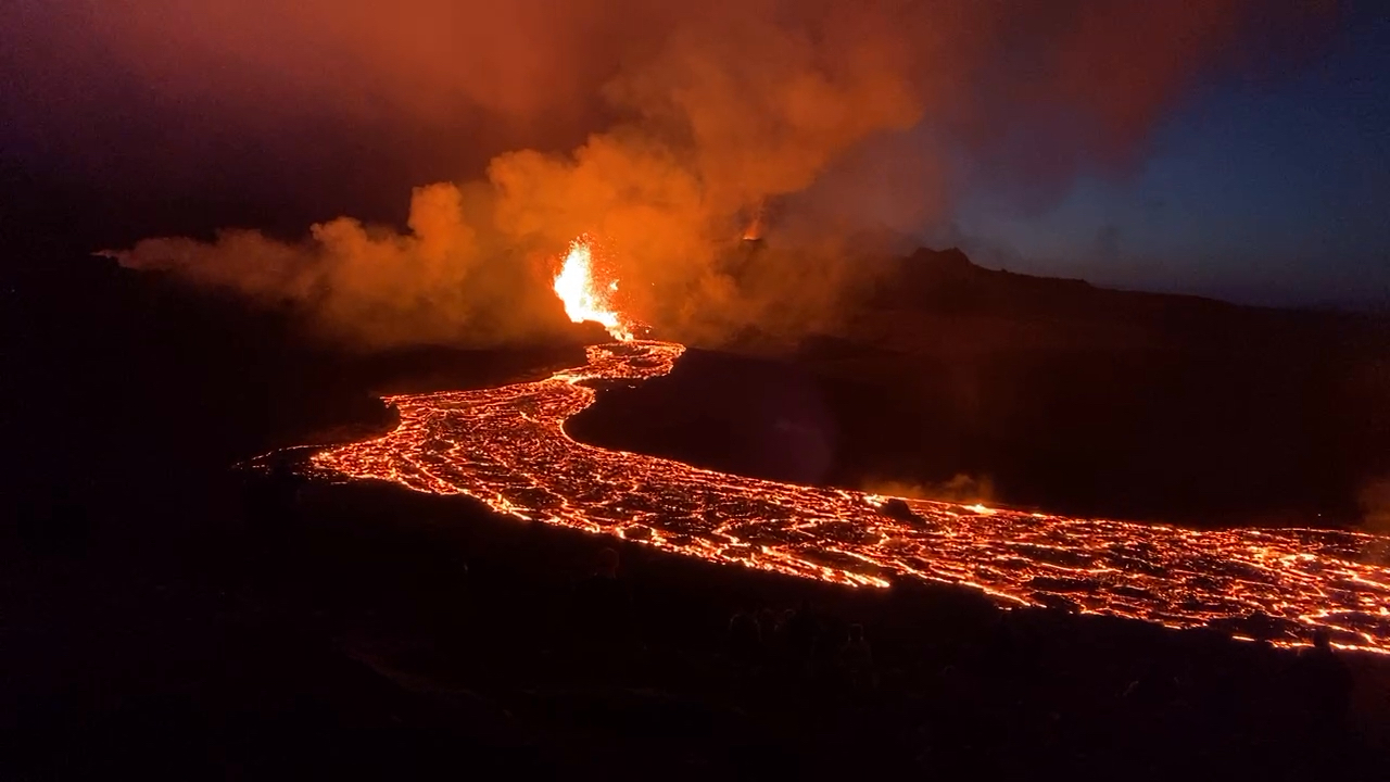 Spewing lava lights up the night just after 11pm, as the volcano shows little sign of slowing down the drama taking place.