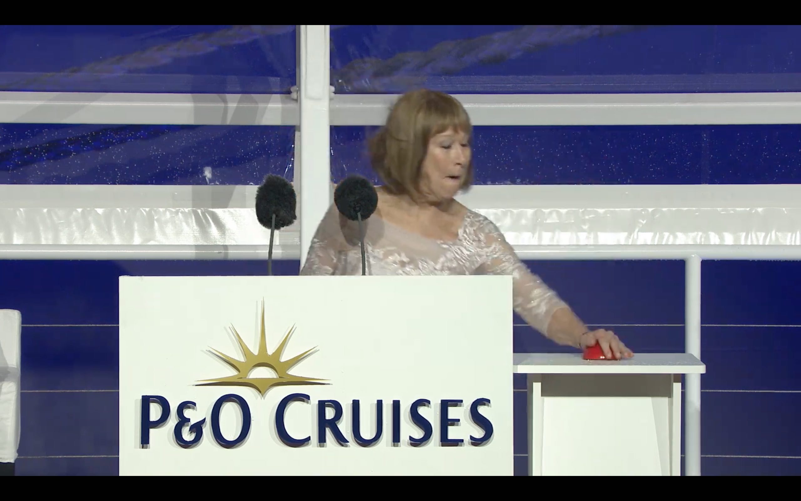 But tonight everything went to plan. The star played as Iona’s Godmother Dame Irene Hays, founder of Britain’s largest independent travel agency Hays Travel, pressed the big red button to trigger the traditional bottle smash.