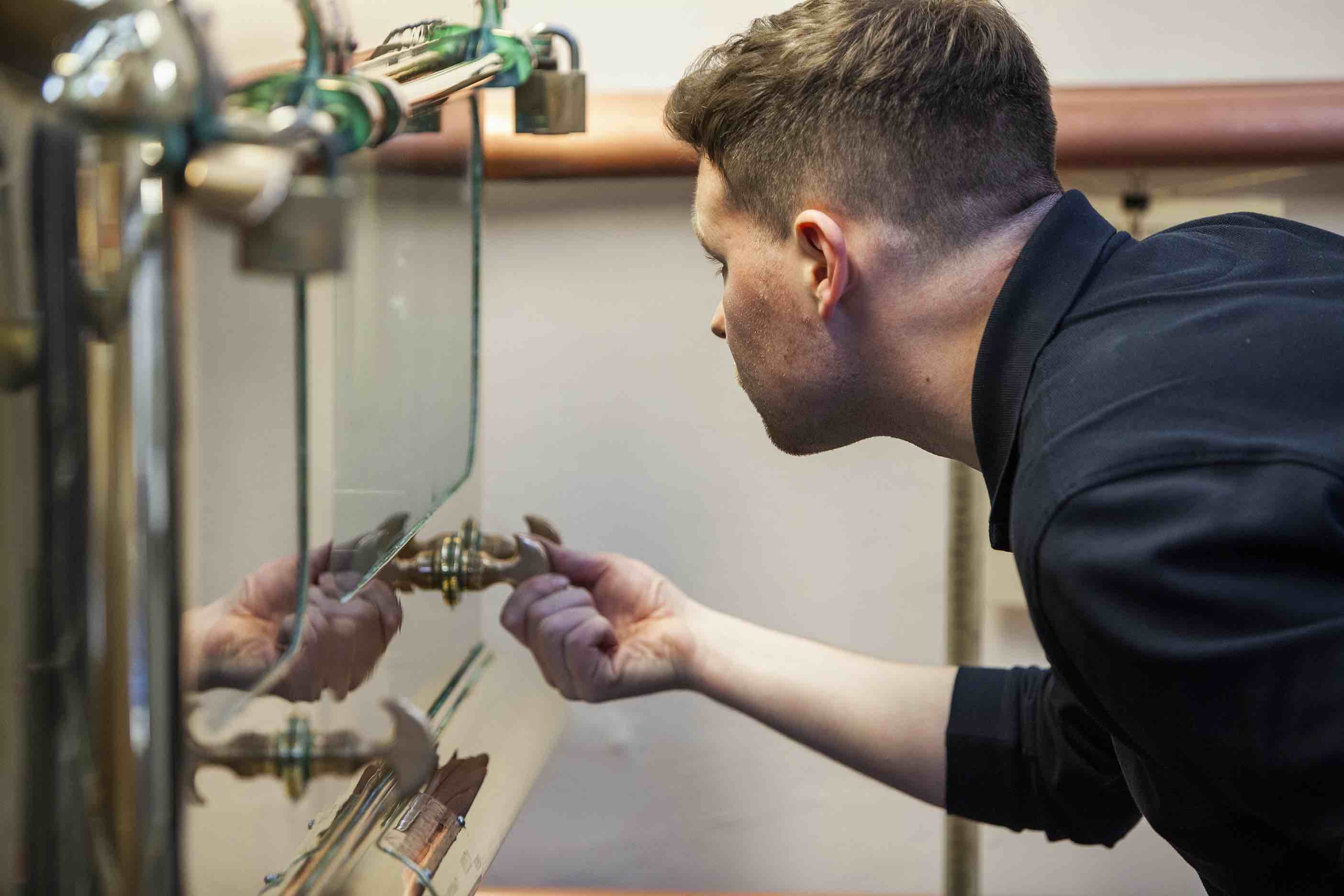 The spirit is carefully monitored in an antique brass spirit safe, with the middle portion of the distillation used to make whisky. The end result is a clear liquid called new make spirit.
