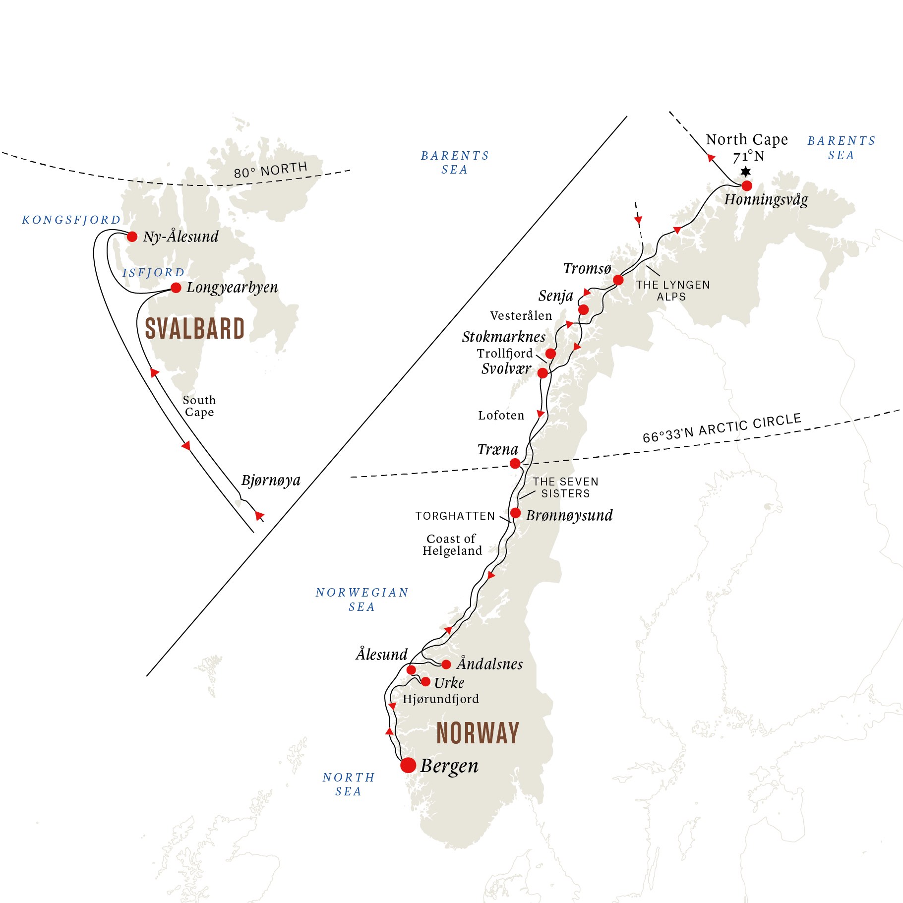 The full roundtrip journey takes 14 days. In addition, a seven-day one-way cruise, either starting or ending in Svalbard, is also available.
