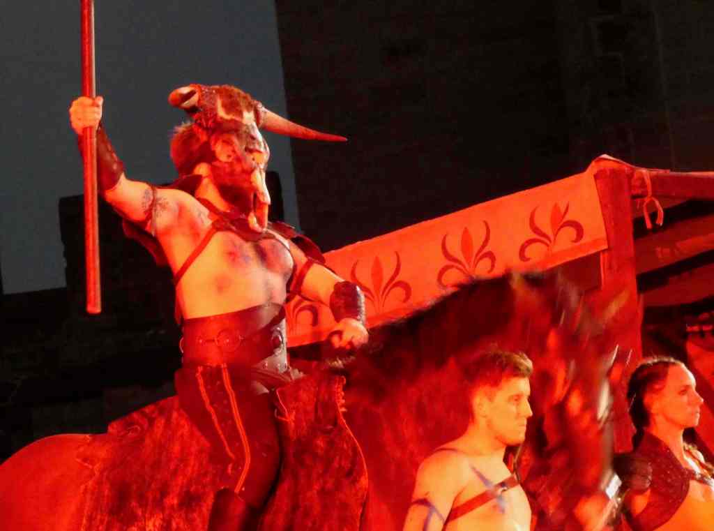 The action plays out not just on the wide raised stage but also in the aisles of a seated audience – a welcome change from the last incarnation of the show which entailed watching the first half on the jousting field then walking uphill to the castle courtyard for the finale.