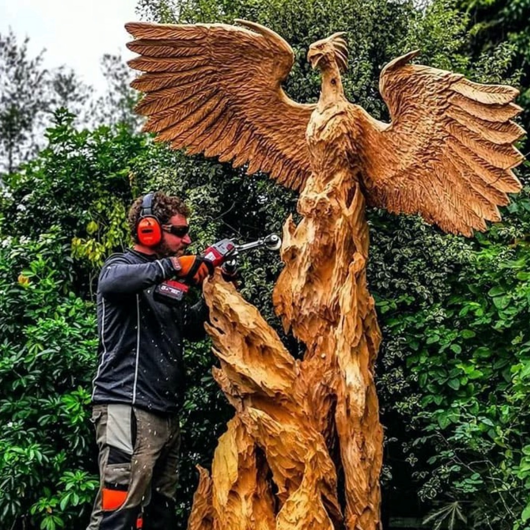 “I love the fact that such a potentially destructive tool can be used to create beauty,” he says of his chainsaw work.
