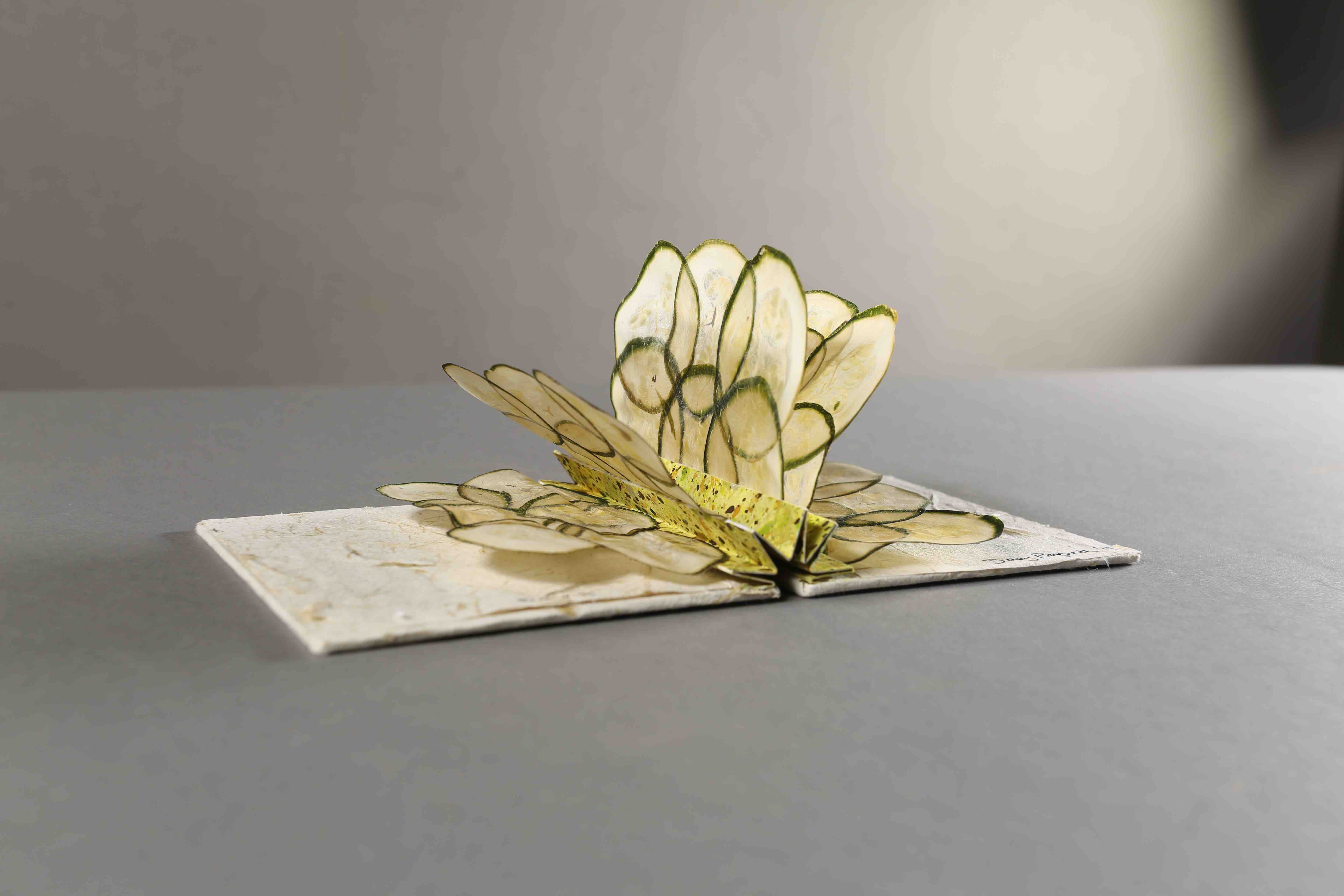 So, if you want a tasty read, there’s Ben Denzer’s 20 Slices of American Cheese, a book made from plastic-wrapped slices of American cheese. Or how about Dizzy Pragnell’s beautiful books, one of which is the lead image in this post, made of vegetables?