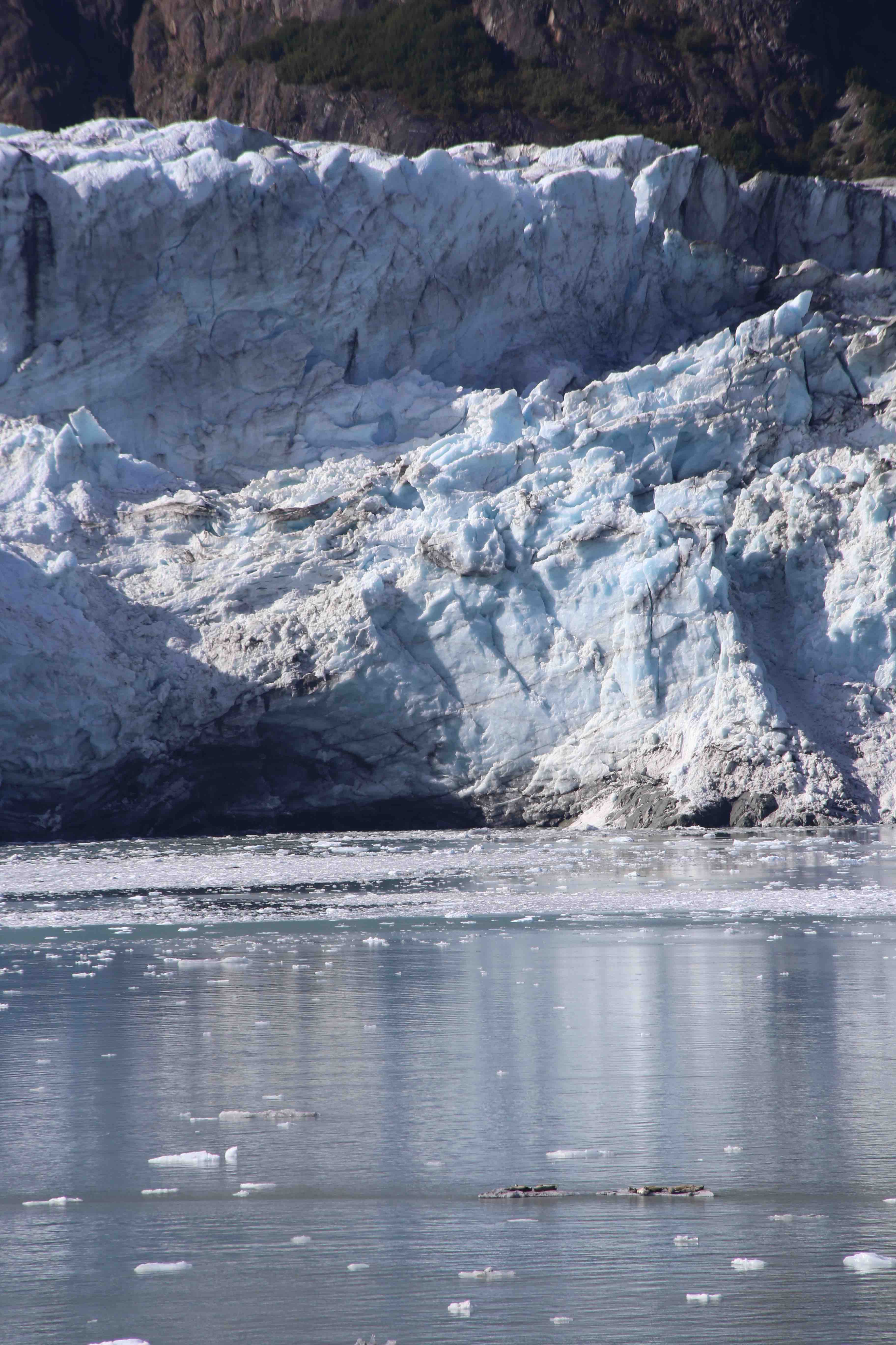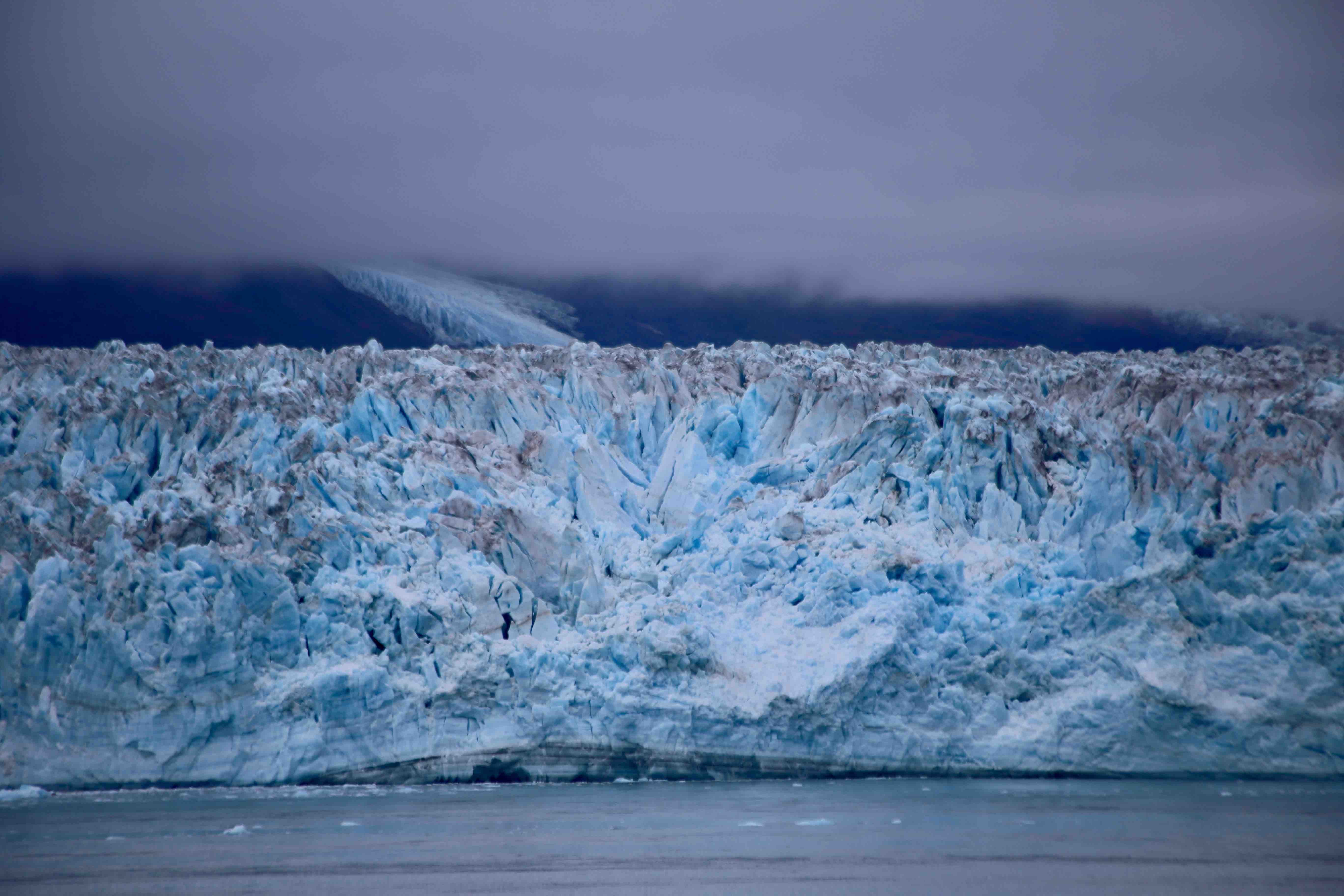 As we sail ever closer, what starts as a misty grey strip grows and grows in stature until, half a mile away – we’re not allowed any closer – it glistens in beautiful blues and tantalising turquoise.
