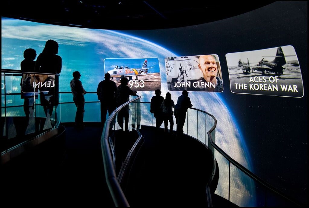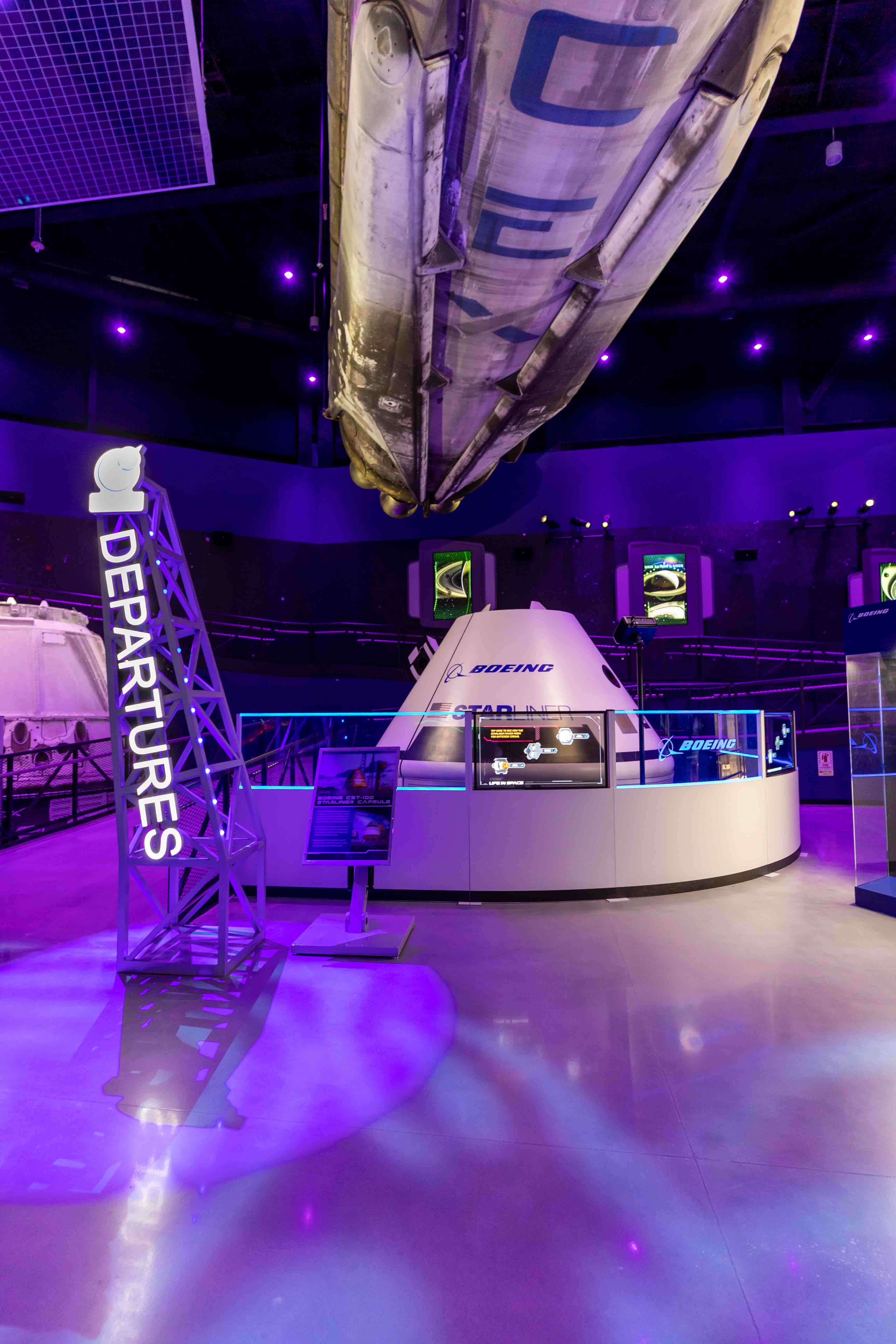 Travellers enter a futuristic setting, ready for their journey, and are surrounded by actual flight-flown artifacts and full-scale models, set around the floor and suspended from above.