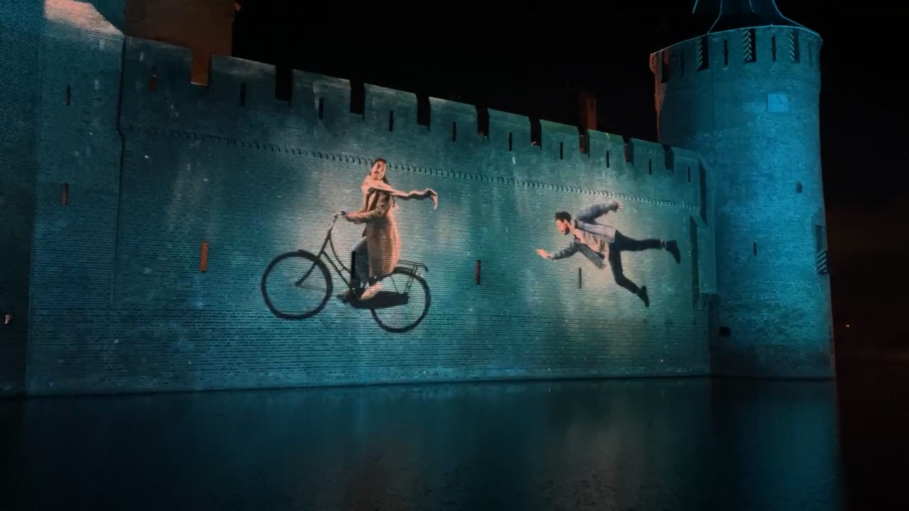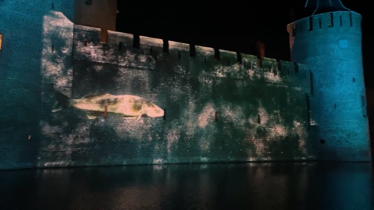 Light-mapping projections showed a cast of characters – and even a sinking James Bond-like car – as the waters rose, and finally submerged the fortress, which instead became home to the fish.