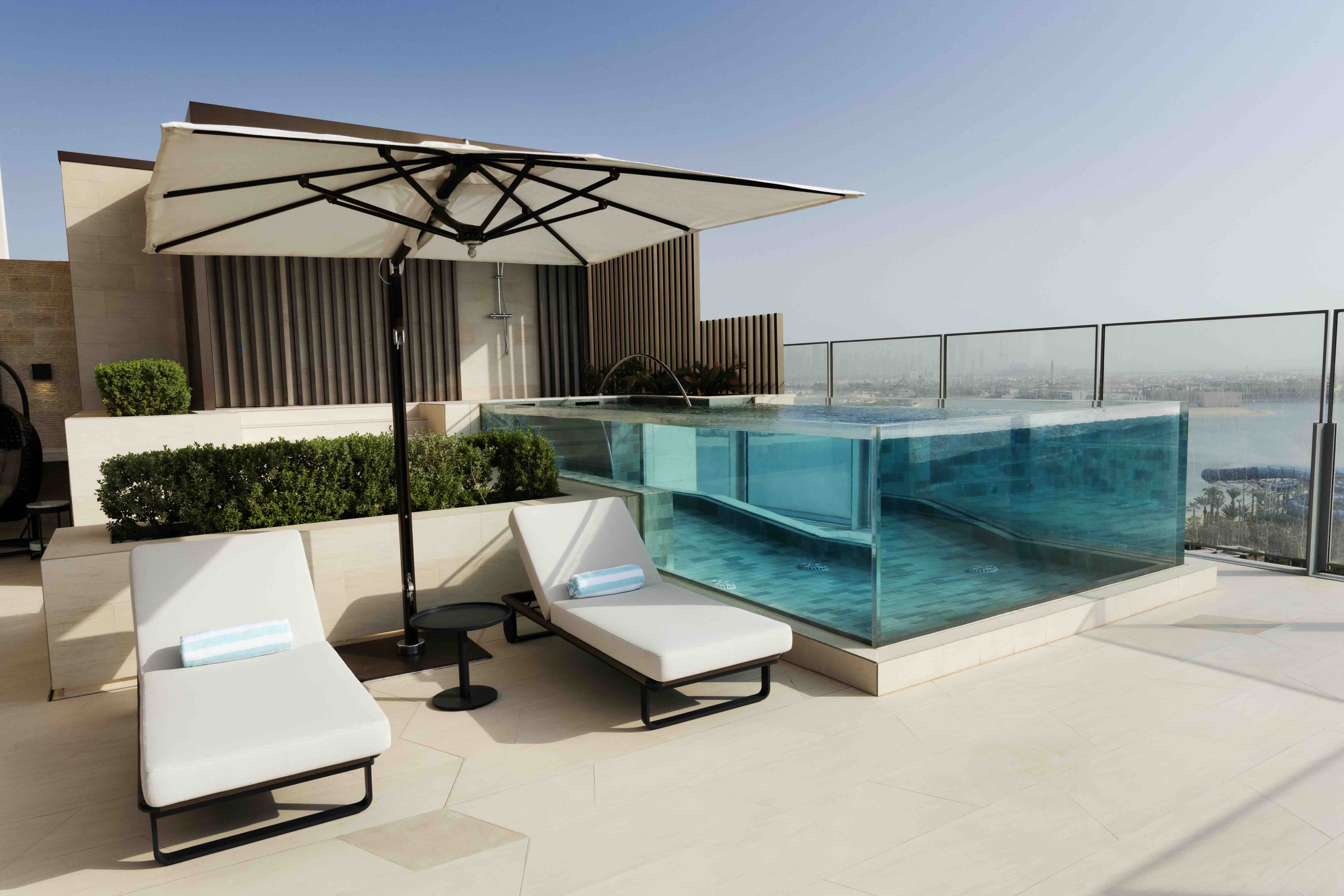 The six towers making up Atlantis The Royal are linked by a 90-metre long Skypool on the 22nd floor (pictured above), which forms part of an outdoor entertainment experience called Cloud 22.