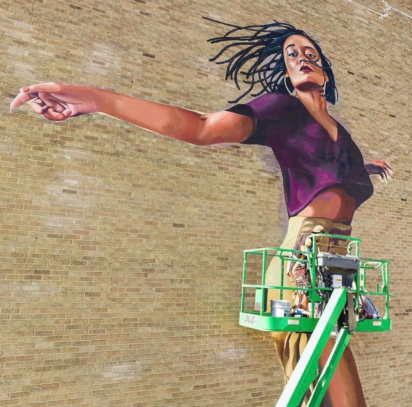 At the bottom of the mural, an inscription reads: “I let go of what has weighed me down. Light as a feather, I ride the wind. Like Black folks have always done. Flying free above the structures built to confine us.”