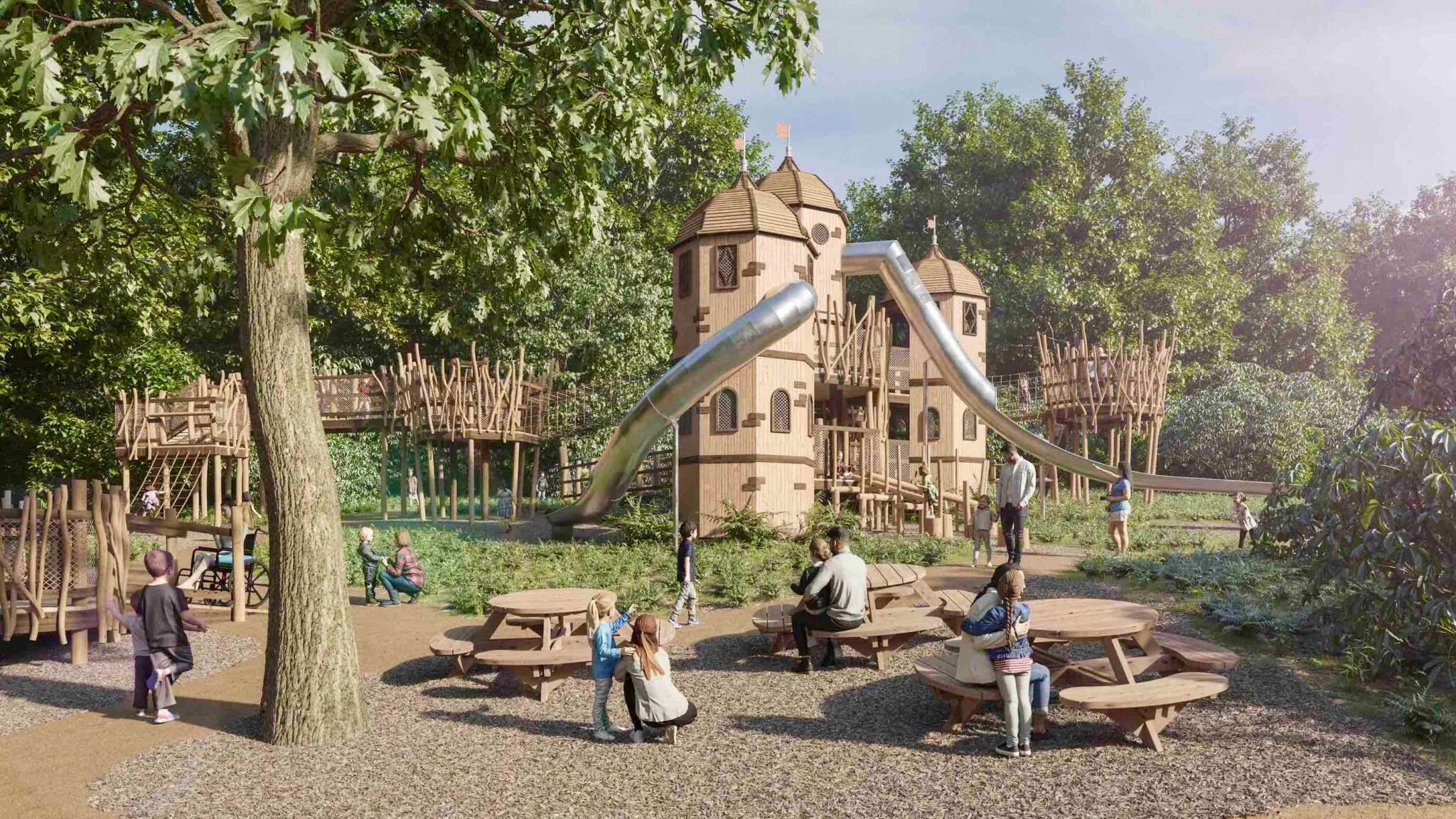 The new play area boasts a multi-level tower featuring three impressive tall spires with ‘pepper pot’ roof detailing – reflecting the distinctive architecture of Burghley – walkways, bridges and lookout towers.
