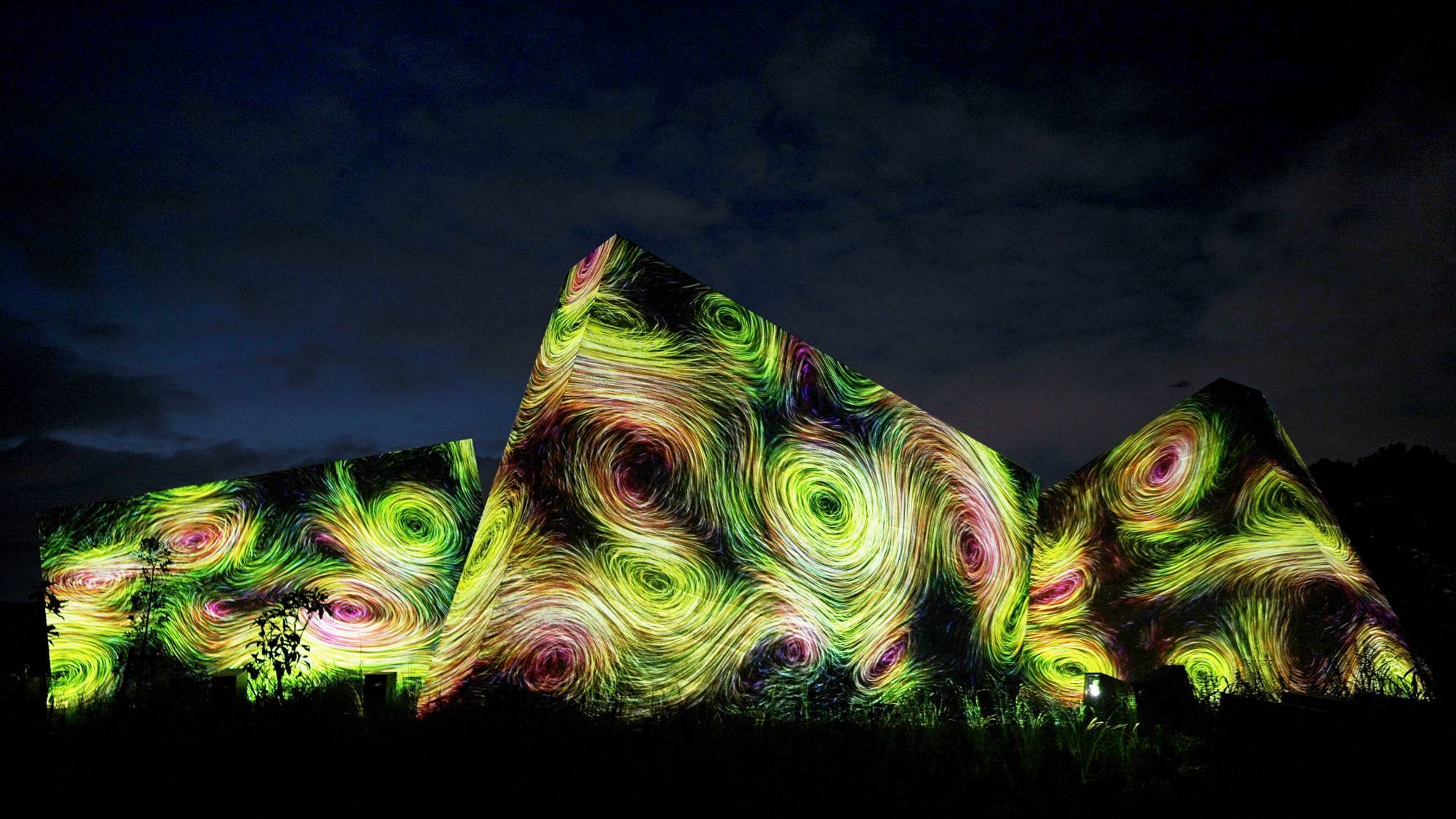 Swirling lights are projected onto three towering monoliths set at crazy angles on an island, the patterns designed to reflect the energy generated by the birds that fly around them.