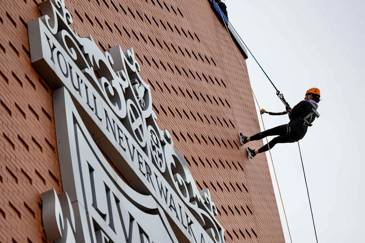 Because supporters can now ABSEIL one hundred feet down past the famous club crest on the 21,000-seater Main Stand at Anfield, after taking in panoramic views over the city from the top.
