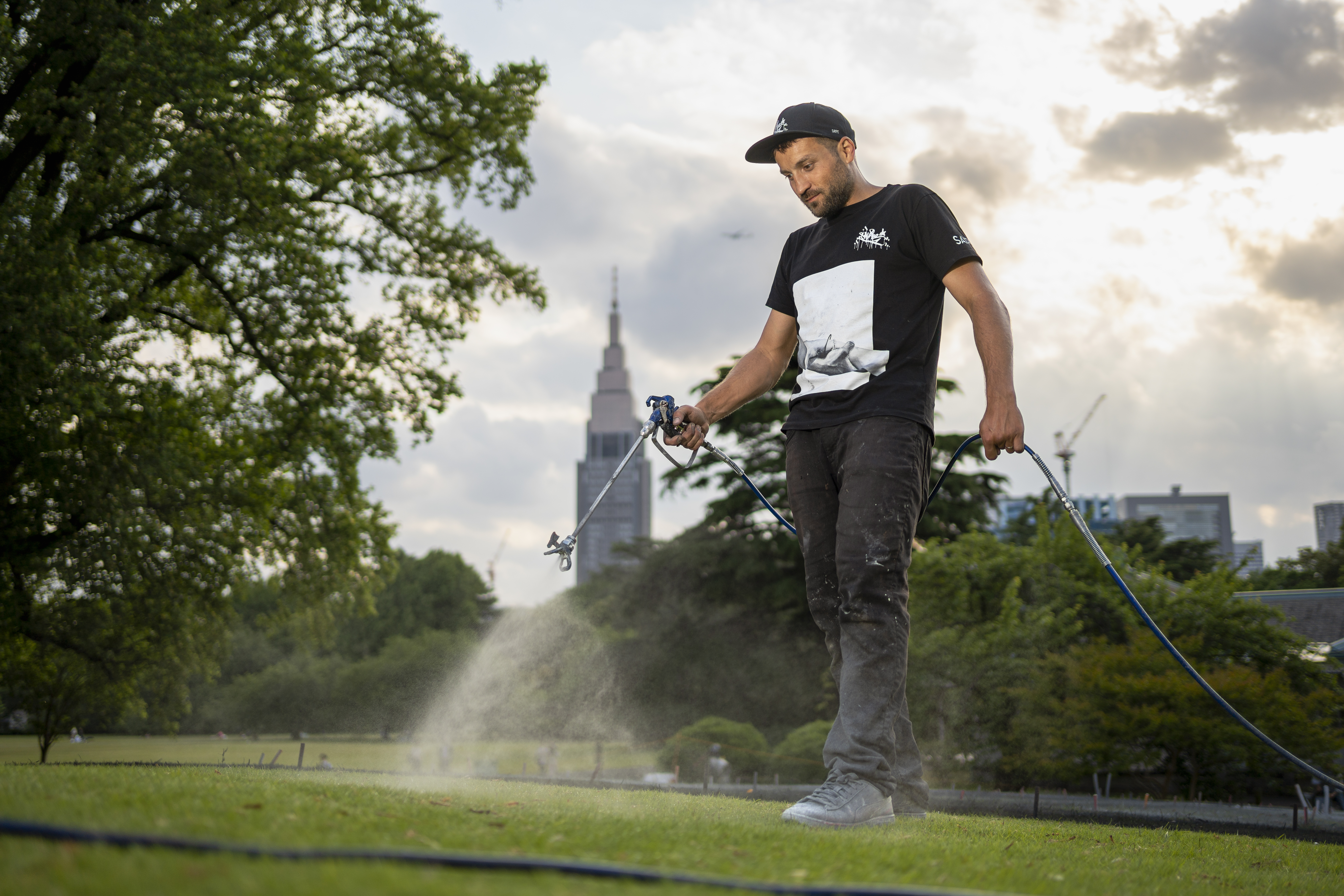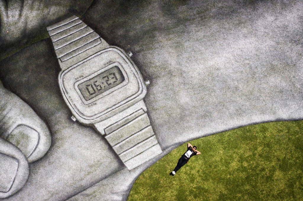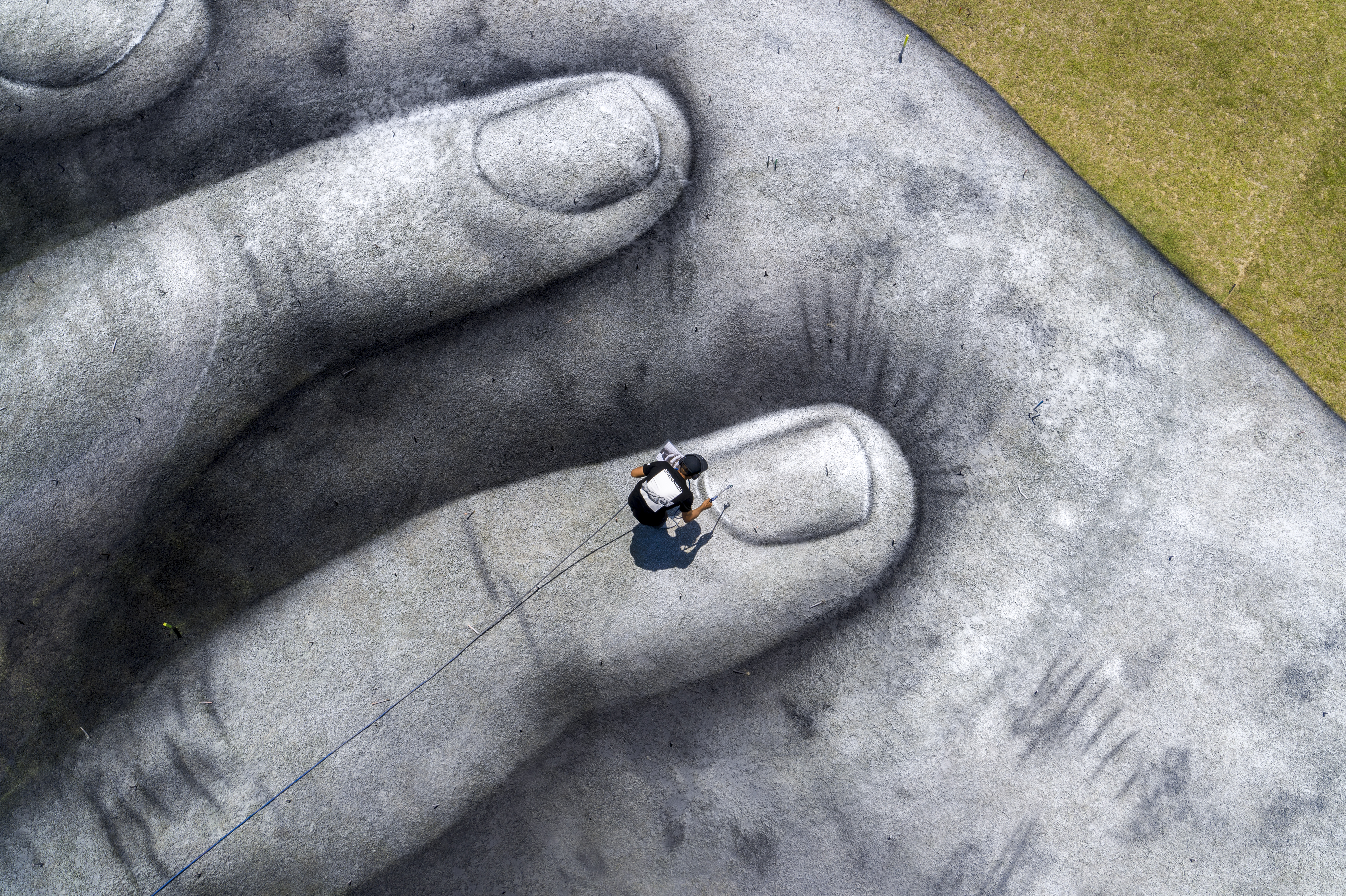 Thirty-four year-old Saype – real name Guillaume Legros – is best known for his ultra-realistic giant paintings, sprayed on the ground, using a biodegradable paint he invented himself.
