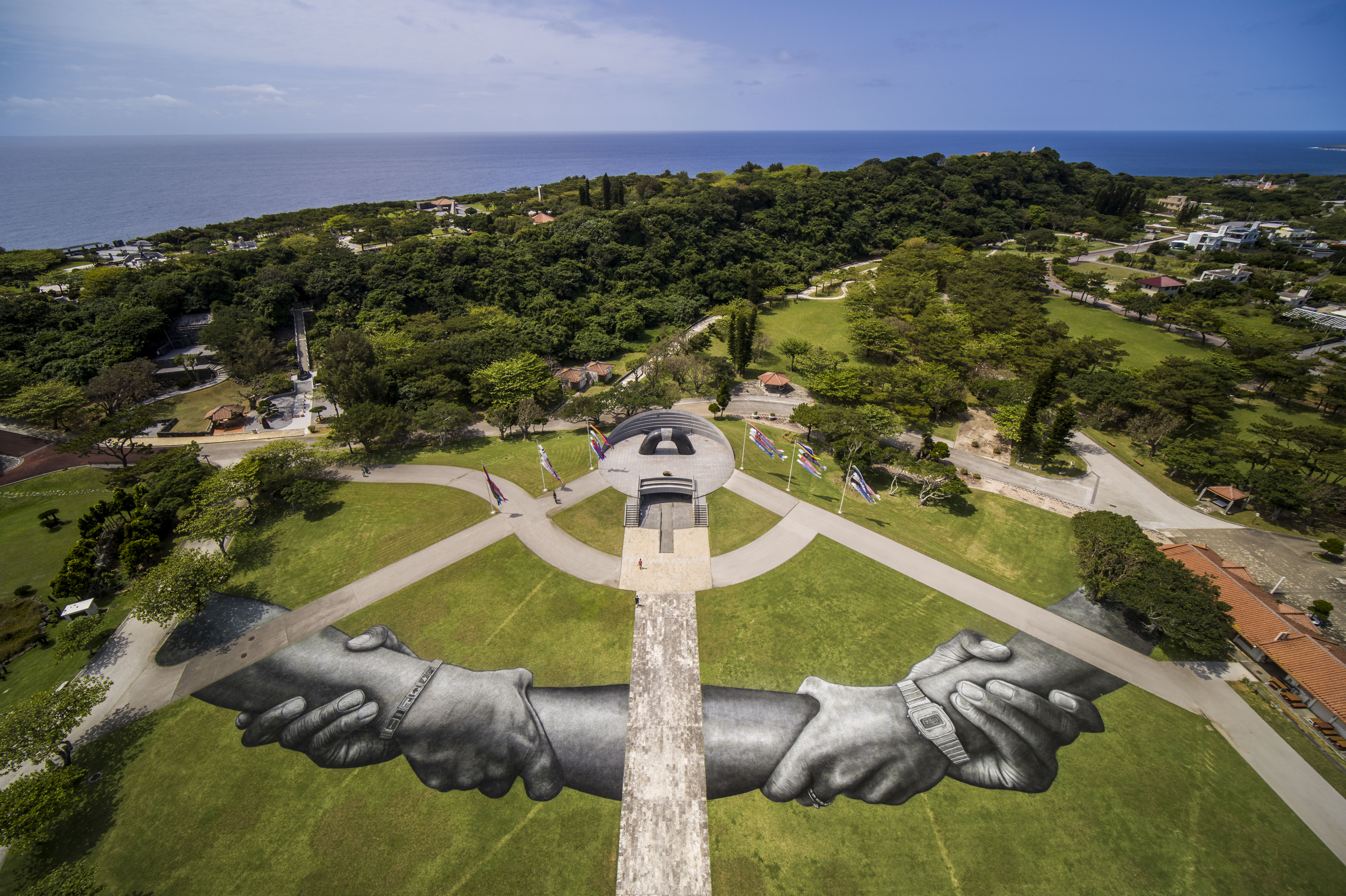 Saype chose the Okinawa Peace Memorial for the first, just a few steps away from the graves of soldiers of all nationalities who fought on the only battlefield on Japanese territory.