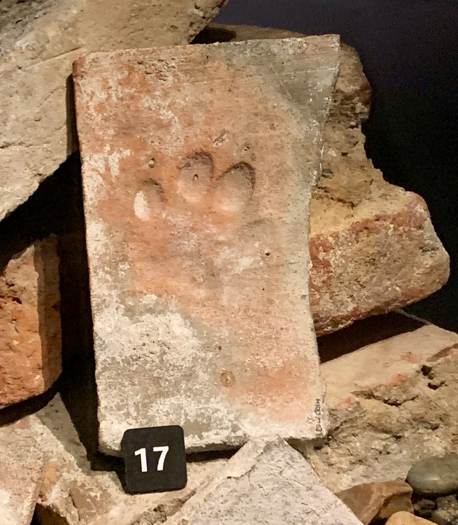 Several small books are to be seen; there’s a bowed musical instrument; plates and drinking mugs have been personalised; there’s even a clay tile across which a dog has walked, leaving its paw print for us to see generations later.