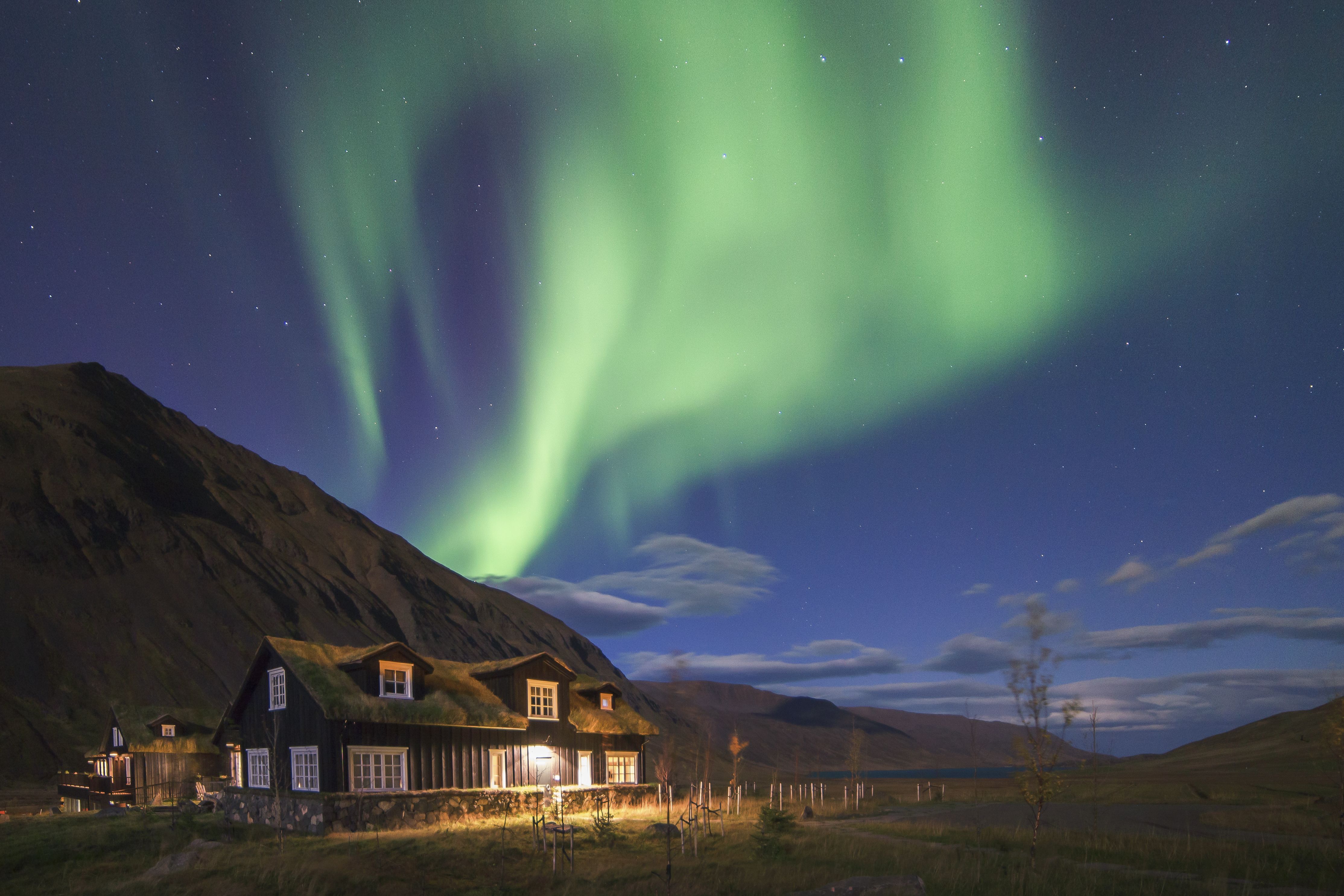 The lodge is surrounded by wild waters and mountains, and the lack of light pollution makes it a prime location for stargazing the night skies and capturing the Aurora’s magic on camera. Close by, adventures include fat biking, skiing and sea kayaking.