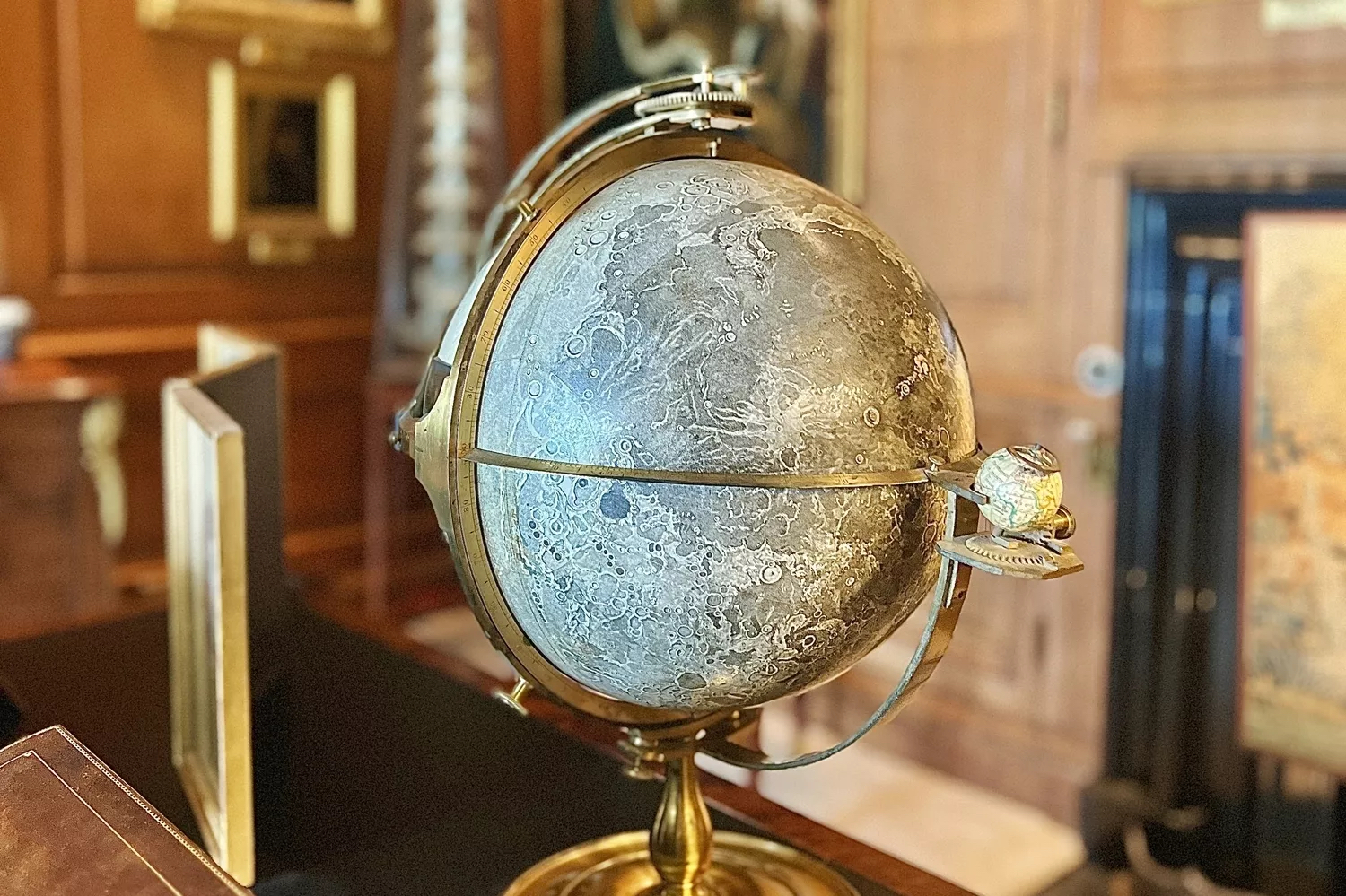 It consists of a large lunar sphere – like today’s globes mapping the Earth – and a small terrestrial sphere to reproduce the motions of the Moon in respect to our planet. Only one side is illustrated, and the other is blank, because only one side of the Moon is visible from Earth.