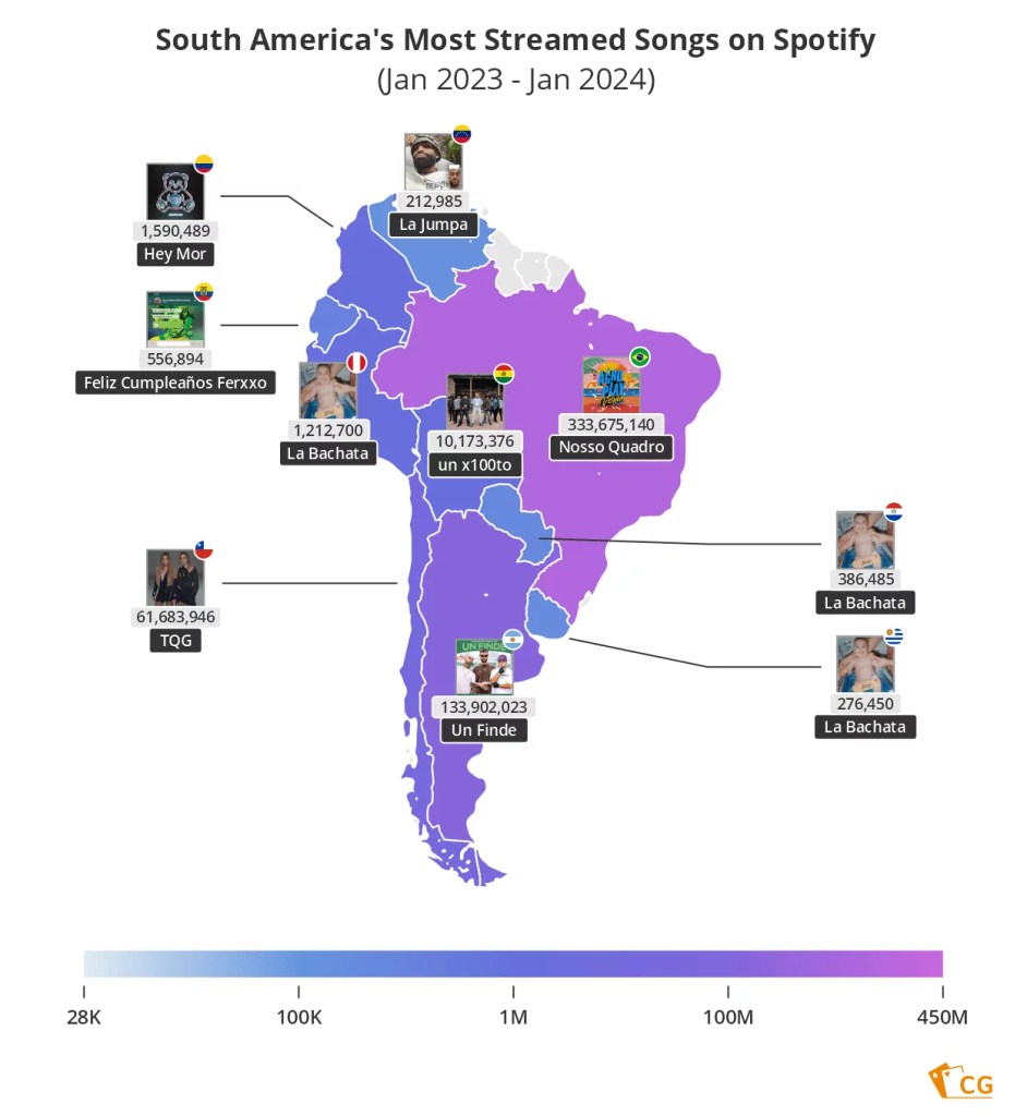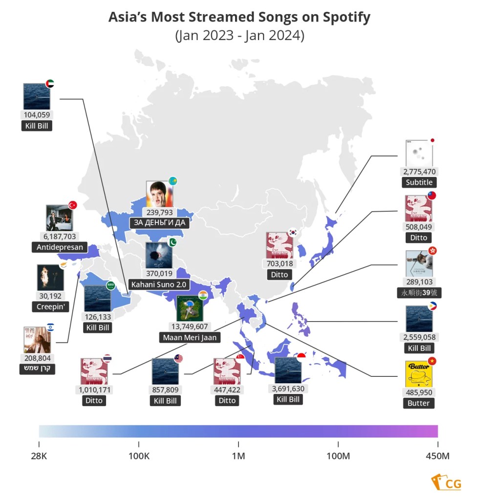 Other big-hitters include Manuel Turizo’s La Bachata (huge in Latin America); Ditto by South Korean girl group NewJeans; Harry Styles hit As It Was and Taylor Swift’s Cruel Summer.