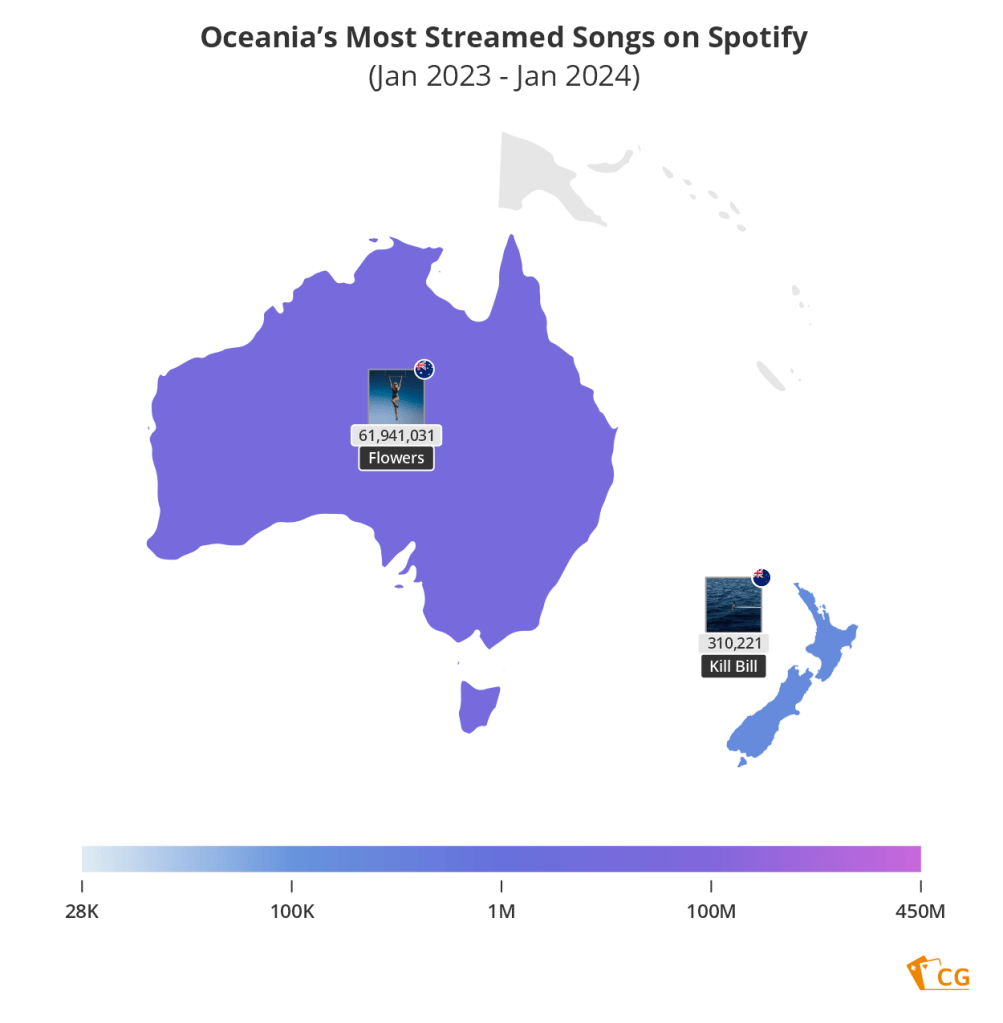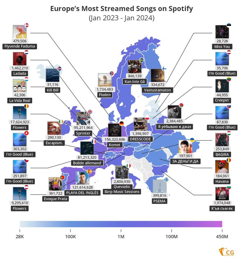 And the results, presented in a Top 20 chart and a series of maps, are fascinating, showing how different regions have different tastes in music. Top of the chart is Miley Cyrus, whose Flowers has been streamed on Spotify 1.65 BILLION times in the last 12 months.