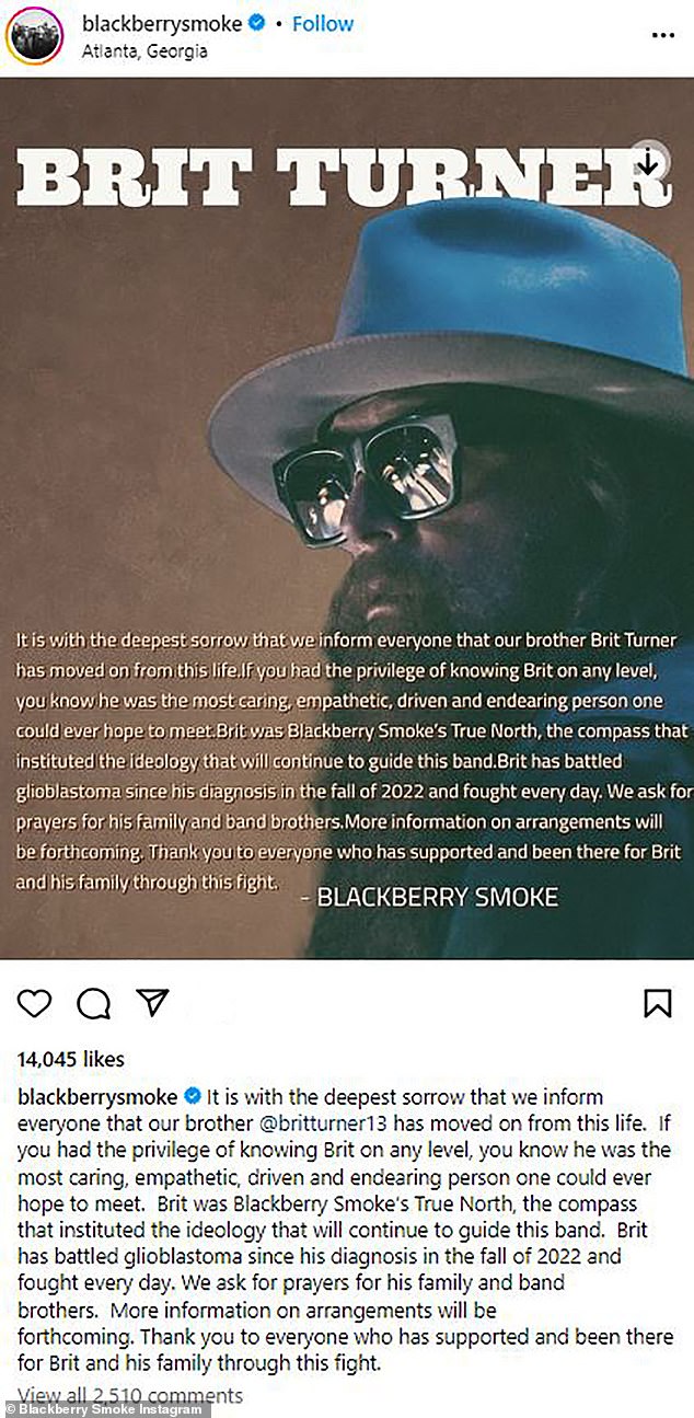 “Brit has battled glioblastoma since his diagnosis in the fall of 2022 and fought every day. We ask for prayers for his family and band brothers.