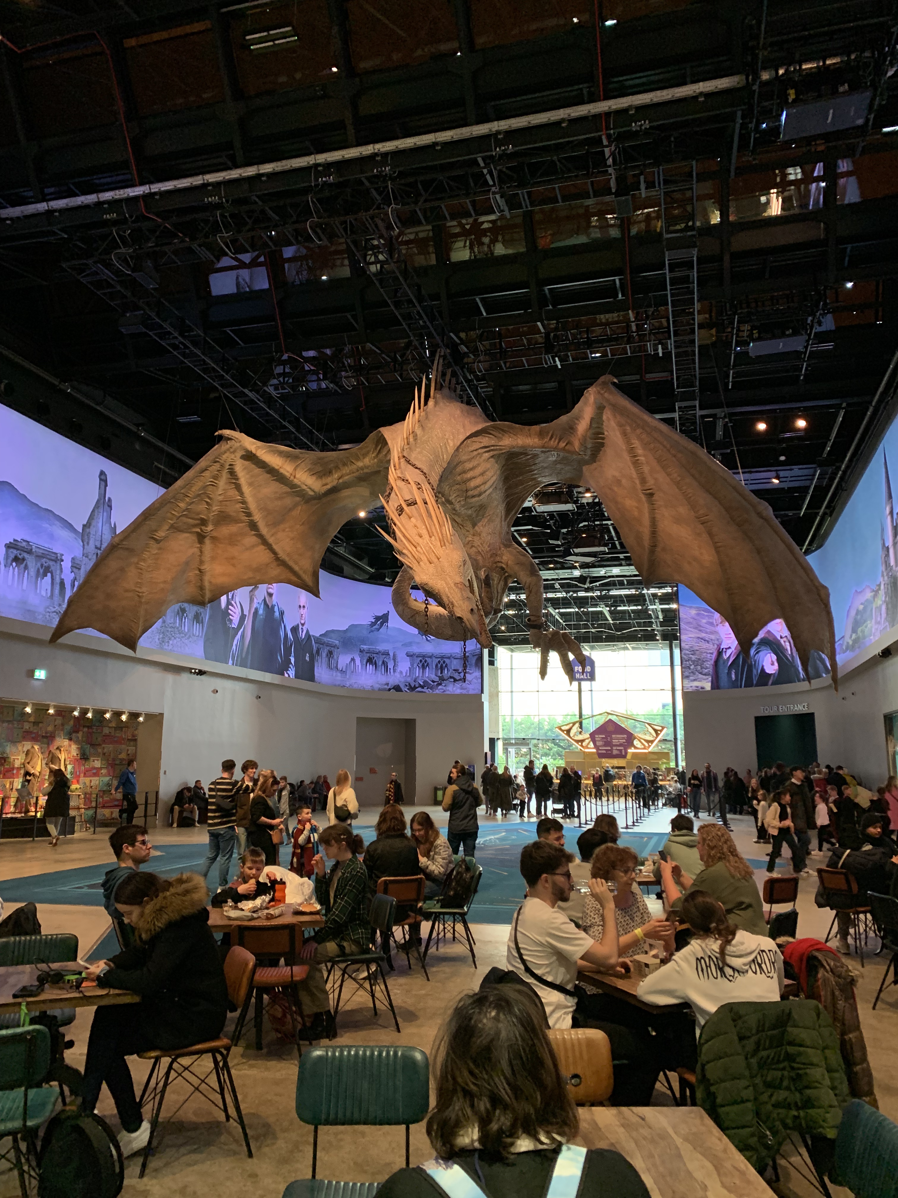 Once inside – there are bag checks and airport-style security arches to pass through – a large open-plan foyer and food hall offers chance to relax before your timed ticket tour starts, but be warned there be dragons. Well, one dragon, but it is huge.
