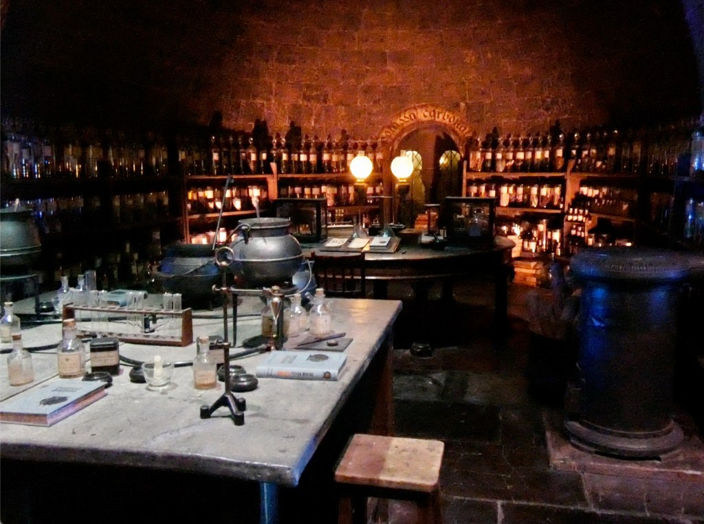 The Potions classroom, domain of first Severus Snape and later Horace Slughorn, is next up, with shelves of mysterious bottles and jars, a self-stirring cauldron and the Half-Blood Prince’s perilous potion textbook among many in evidence.