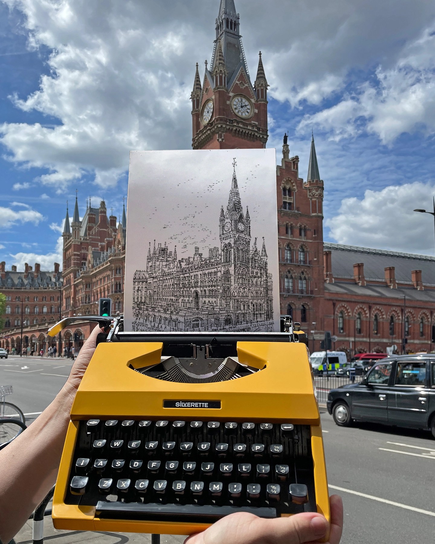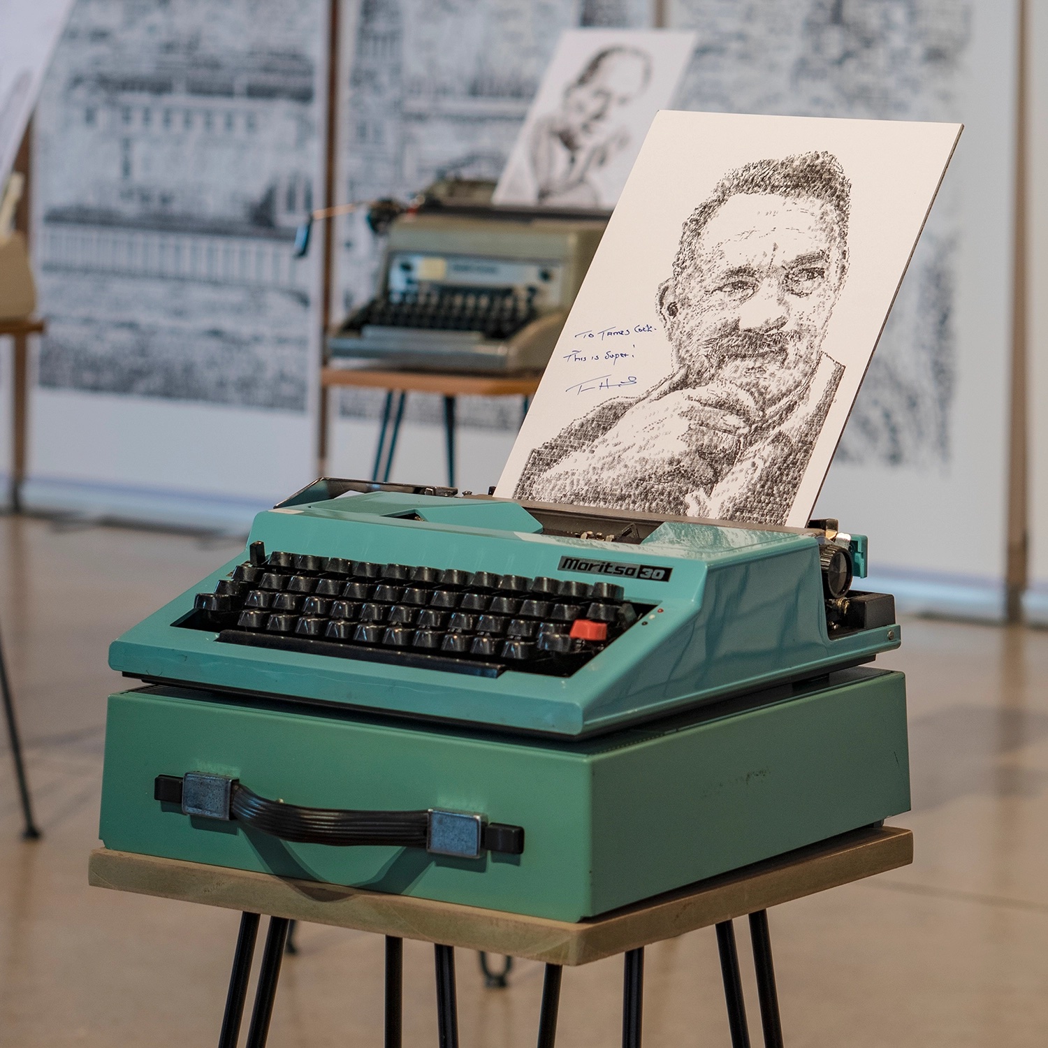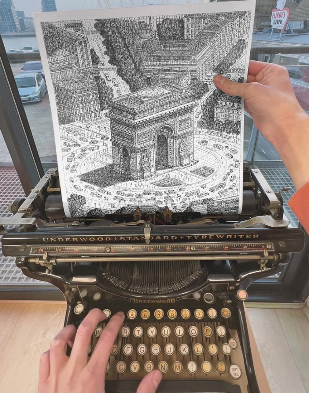 In the past ten years, the London artist has produced more than 300 typewritten drawings, using 60 typewriters, most of which have been generously donated by fans of his work.