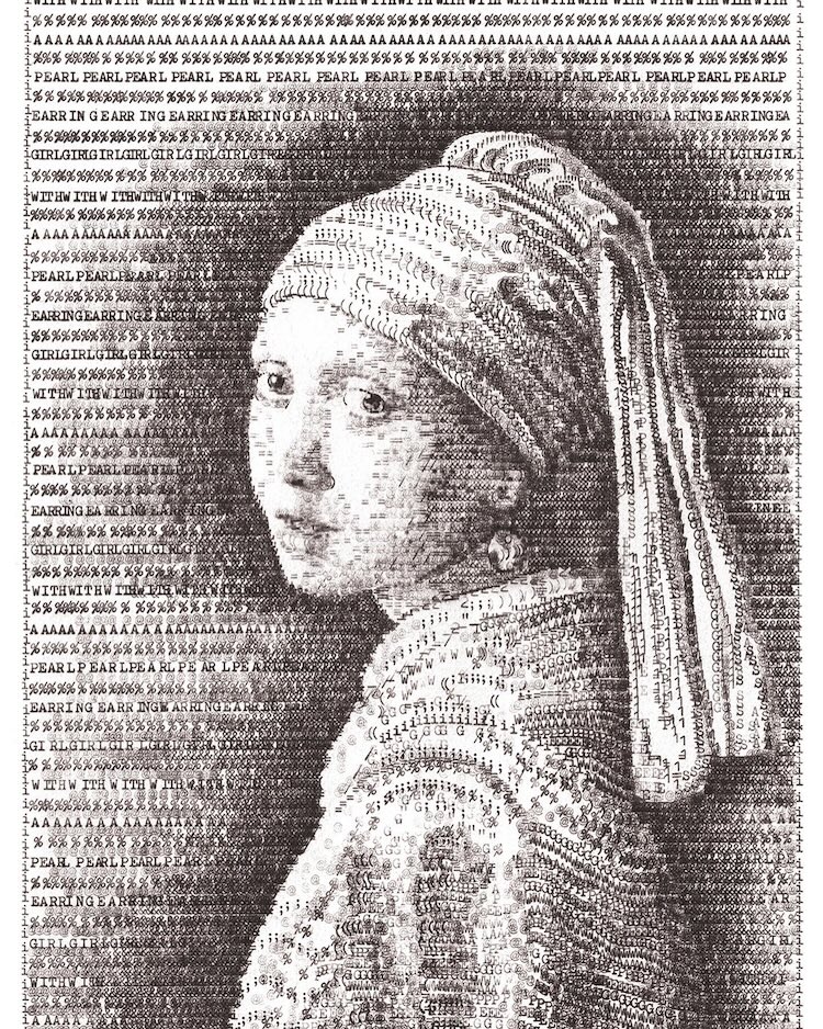 His recreation of Vermeer’s Girl with a Pear Earring, for example, is composed of the words “earring,” “girl,” and “pearl” repeated over and over again on the page.