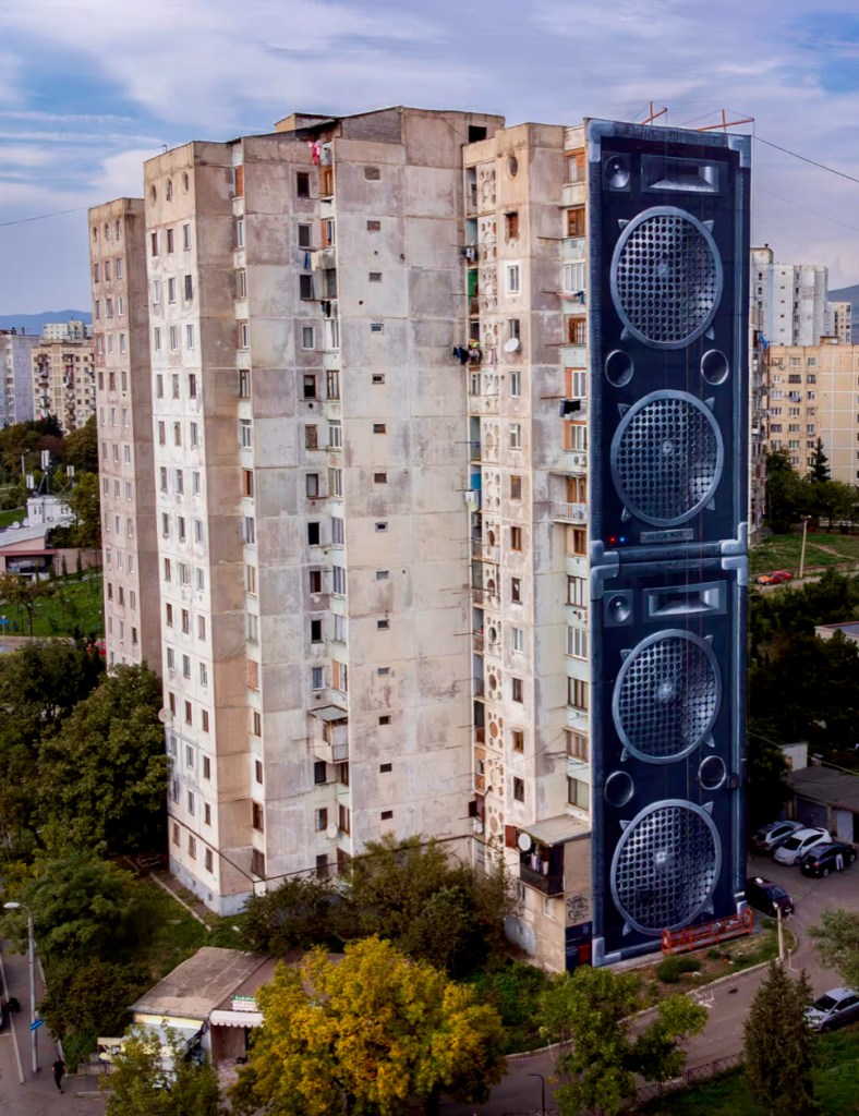 This one, meanwhile, was painted in the Russian settlement of Solnechnodolsk in the North Caucuses, and bears the title From Russia With Love. Spot the Russian doll on one of the shelves!