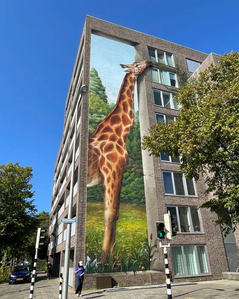 These brilliant bookcase artworks have been created by the Utrecht street artist, who canvasses local residents to see what their favourite books are, and then incorporates them into his larger than life designs.