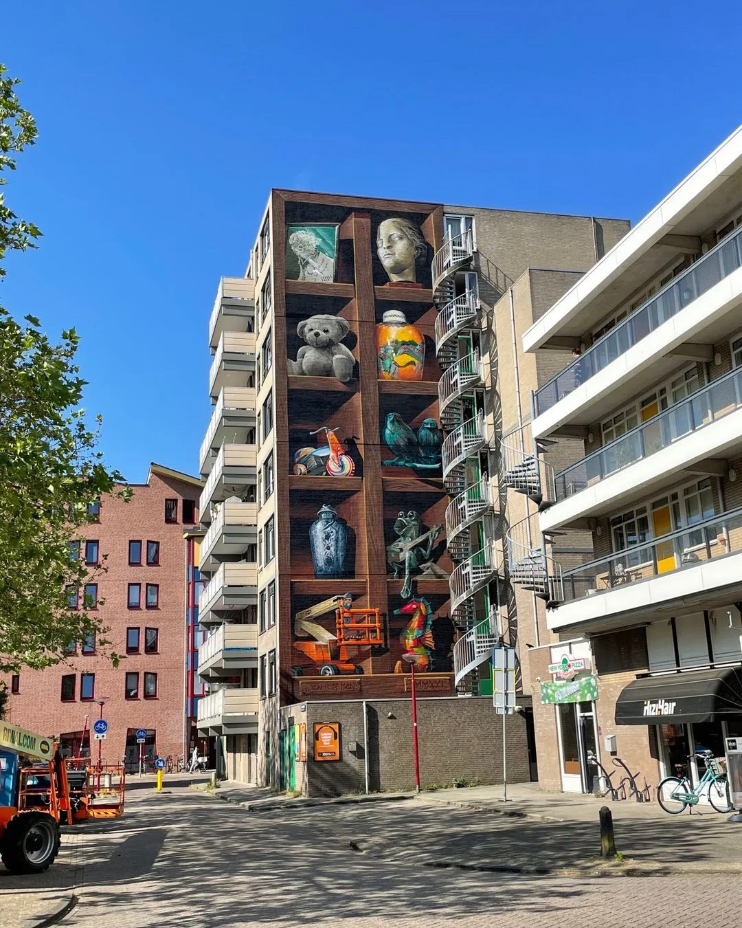 But it’s not just books that are chosen by those living in the buildings the artist paints. This piece, titled Cabinet, in The Netherlands city of Nieuwegein, incorporates cherished curios chosen by residents. You have to love the teddy bear!