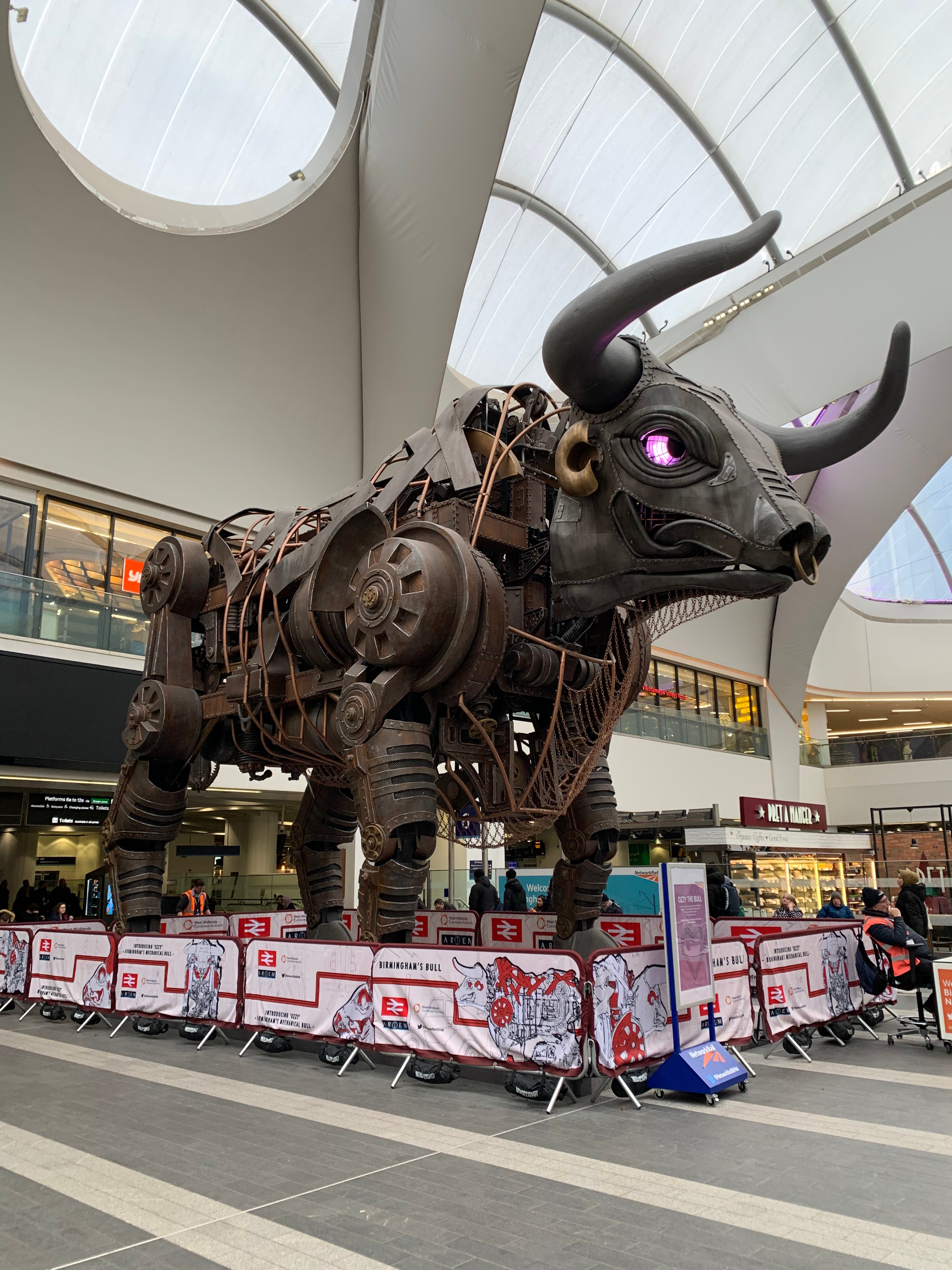 The giant mechanical bull that was the star of Birmingham’s Commonwealth Games in 2022 was dismantled after the games and painstakingly rebuilt on the concourse of Birmingham’s New Street Station. His name? Ozzy, of course!