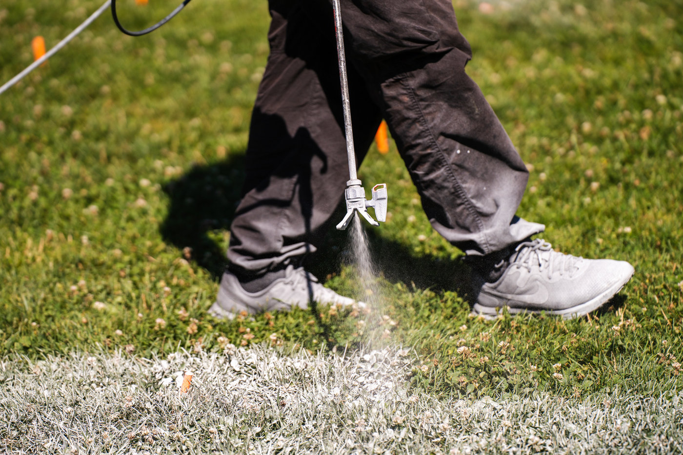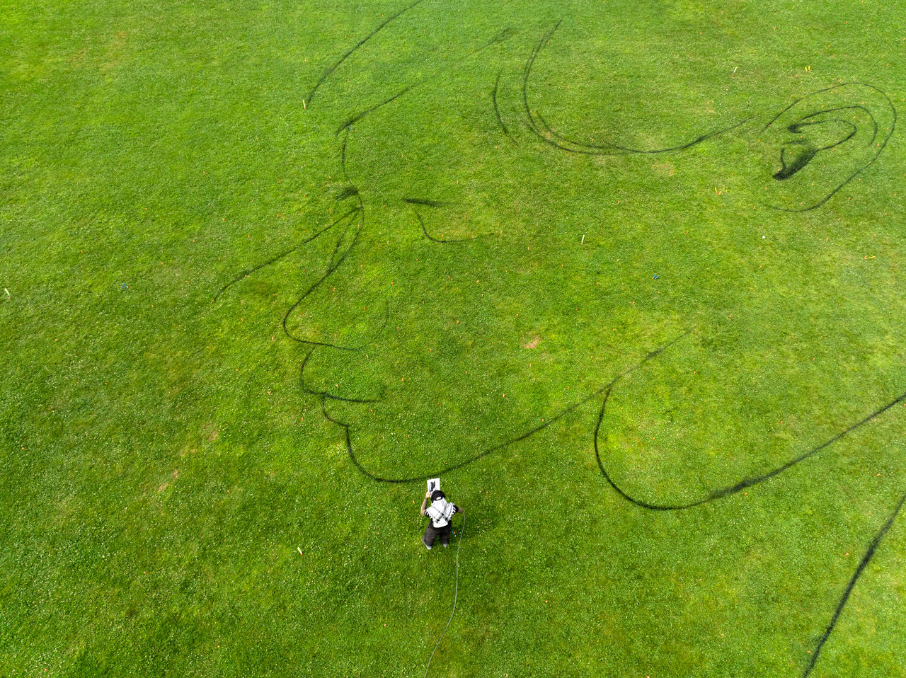 The artwork, created directly on the grass using fully biodegradable paint, spans a surface of 8,500 square metres and took four full days of on-site work to complete in the middle of a heatwave.