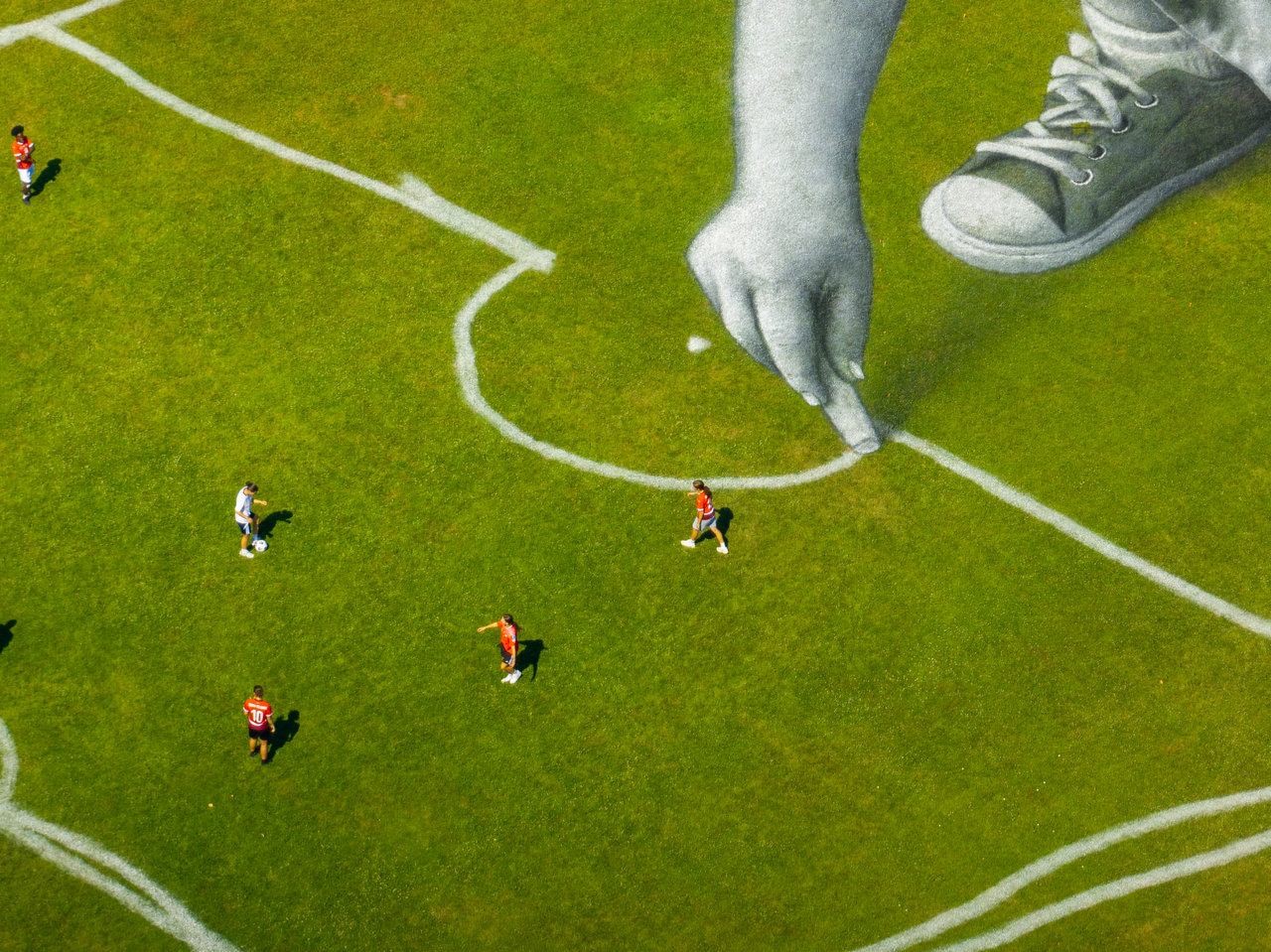 “This is the message I wanted to convey here, depicting a child drawing on the ground what resembles a football field. She imagines her own field, shaped to her scale, where no matter where one comes from, these lines become, above all, a place of sharing.