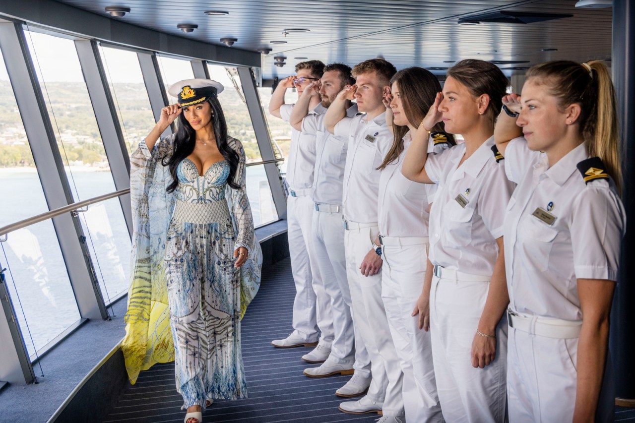 Global superstar Nicole Scherzinger pictured on the bridge of P&O Cruises new ship, Arvia, in Barbados today with some of the deck officers. This afternoon, Scherzinger the ship’s godmother, will officially name Arvia in a spectacular beachside ceremony.